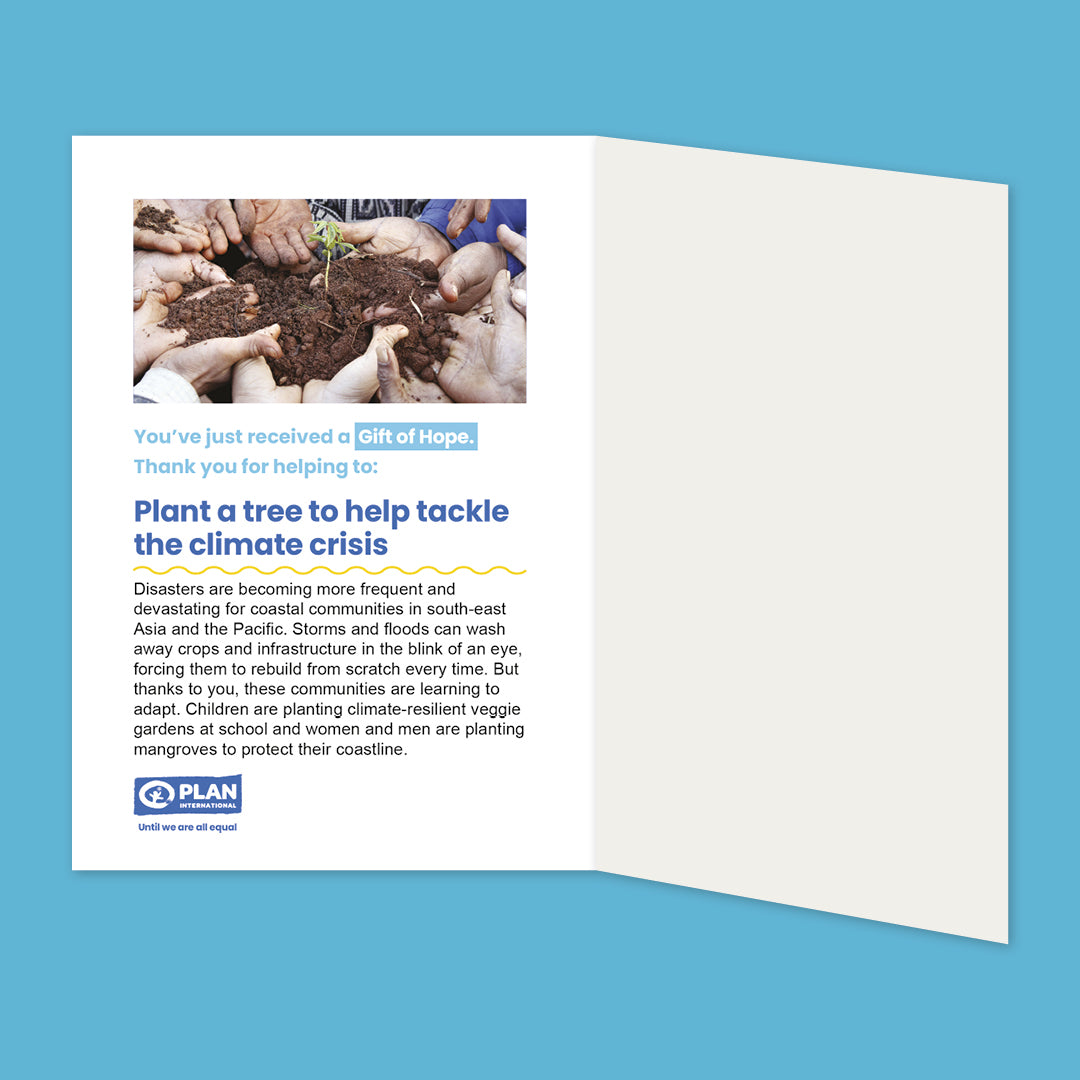 Once you choose your gift (or gifts!), we’ll send you a physical card or digital card you can forward via email that shows the gift in action. Then all you need to do is write your personal message and forward it on to the gift recipient. Just want to support our work? Buy one for yourself and proudly display it on your mantelpiece!